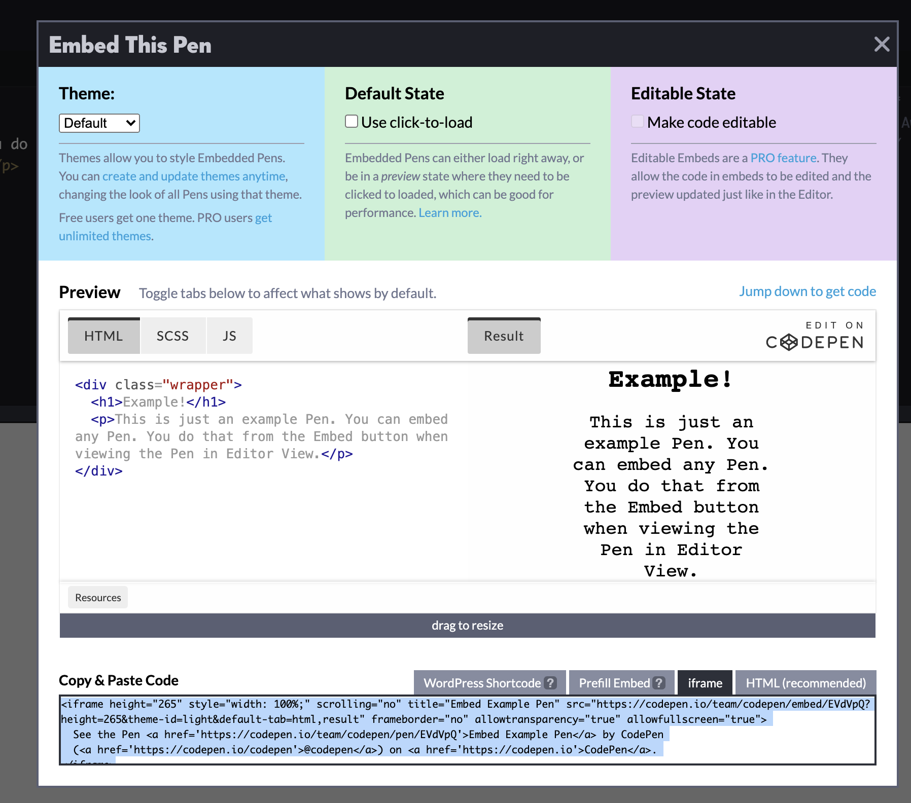 You can embed code previews from CodePen using the Embed option in zeroheight.