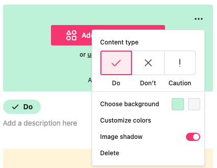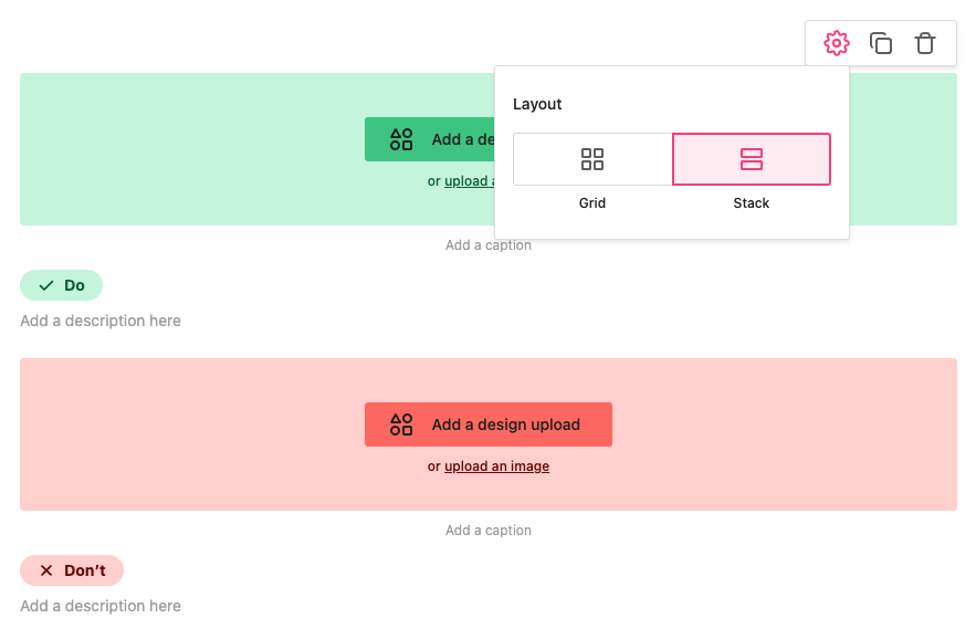 Our Rules block consists of do's, don'ts, and cautions. These are a staple of any good design system documentation site. You can use them to give examples of how particular components should be used and common mistakes to avoid.