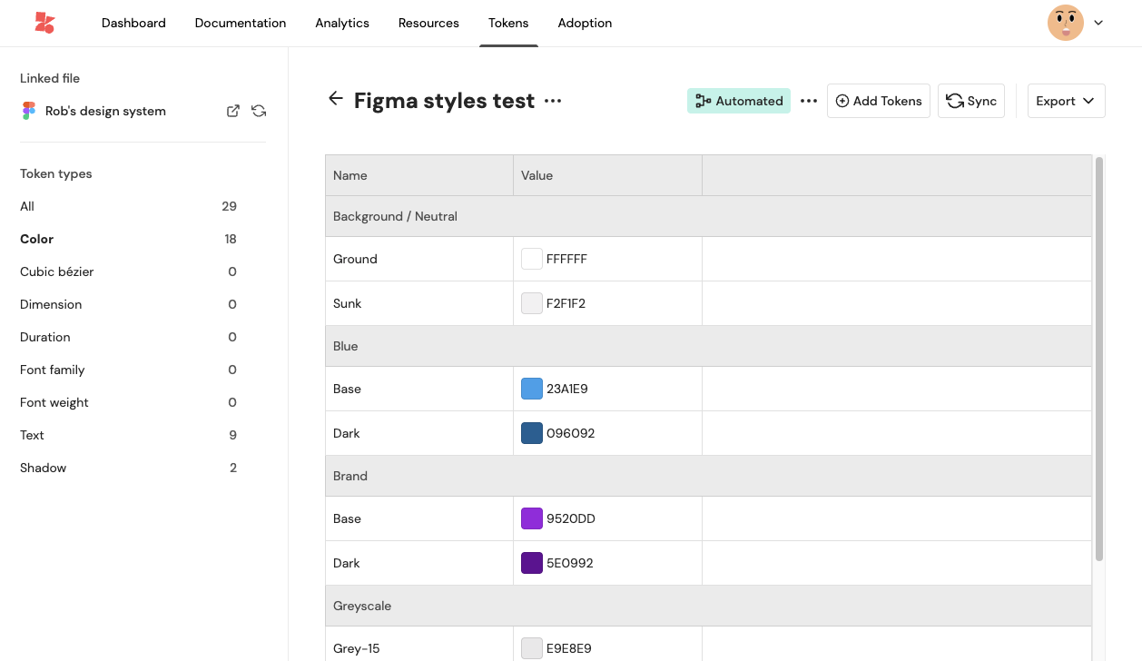 Design tokens imported from Figma Styles can be automated so changes to your Figma file can be pushed code repositories on sync. This allows you to automate your Figma to code pipeline and speed up delivery of tokens from design to engineering.