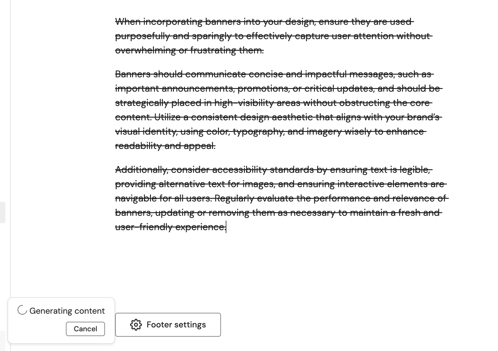 Once you click select an option, your original content is struck out and new content will be streamed into the page. You know content is still being generated by the Generating content modal that shows on the bottom left of the editor.