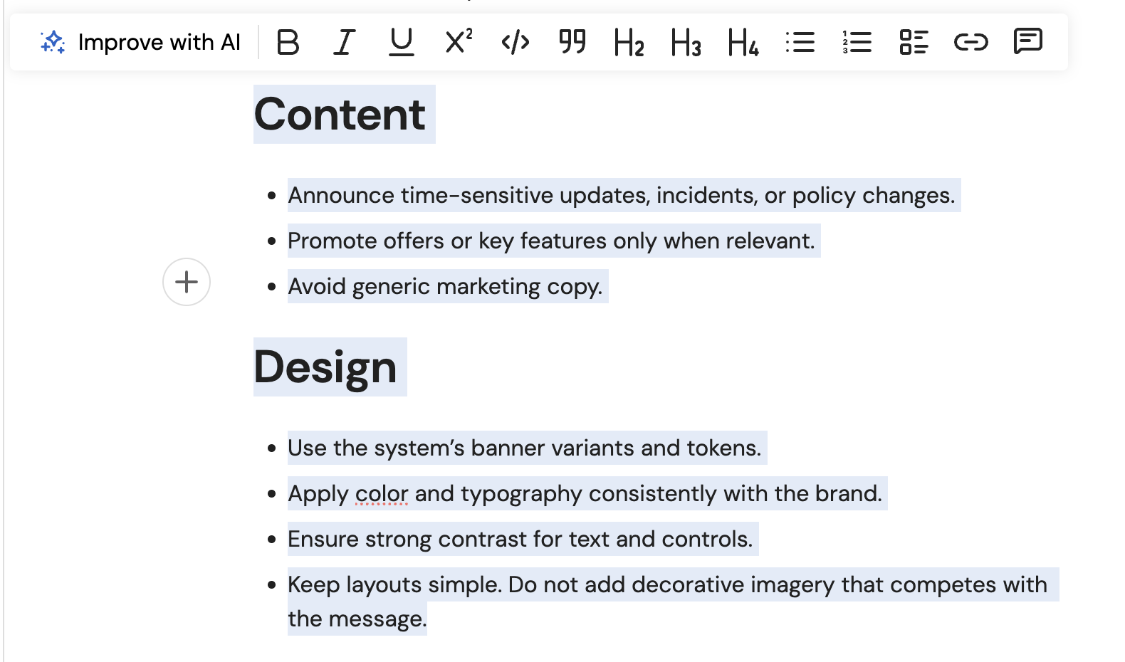 Improve with AI helps you to improve the writing in your documentation. Select the text you want to improve and choose from the various options to modify it.