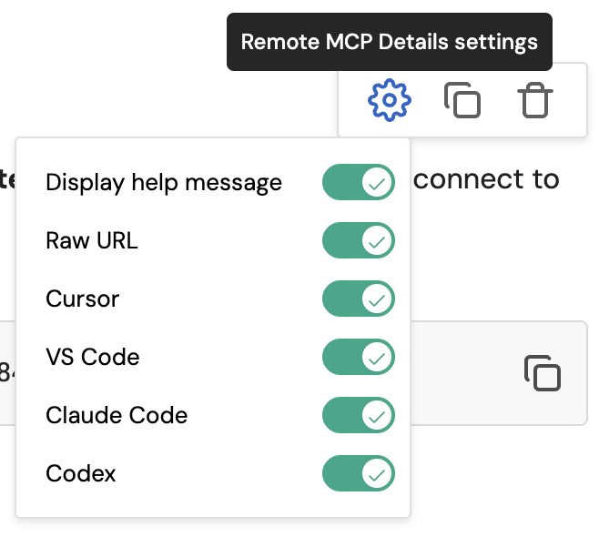 - Select the Claude Code or Codex tab in the remote MCP details block
