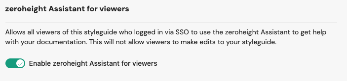 The zeroheight Assistant for viewers is available on any styleguide that is protected by SSO — admins and editors can enable the assistant by opening styleguide settings, navigating to AI settings and toggling on the Enable zeroheight Assistant viewers.
