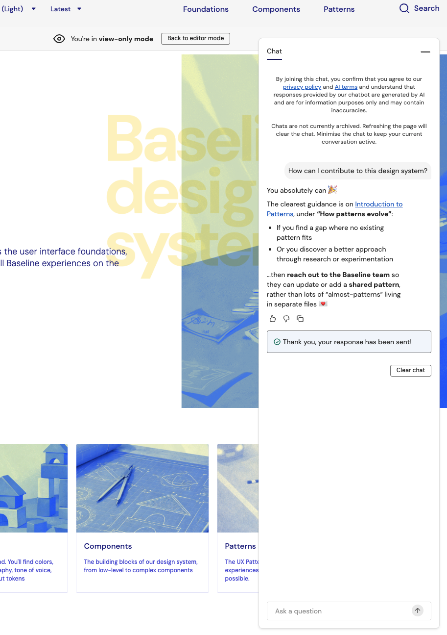 The zeroheight Assistant for viewers provides visitors to your documentation a way to access the documentation via a chatbot/assistant interface
