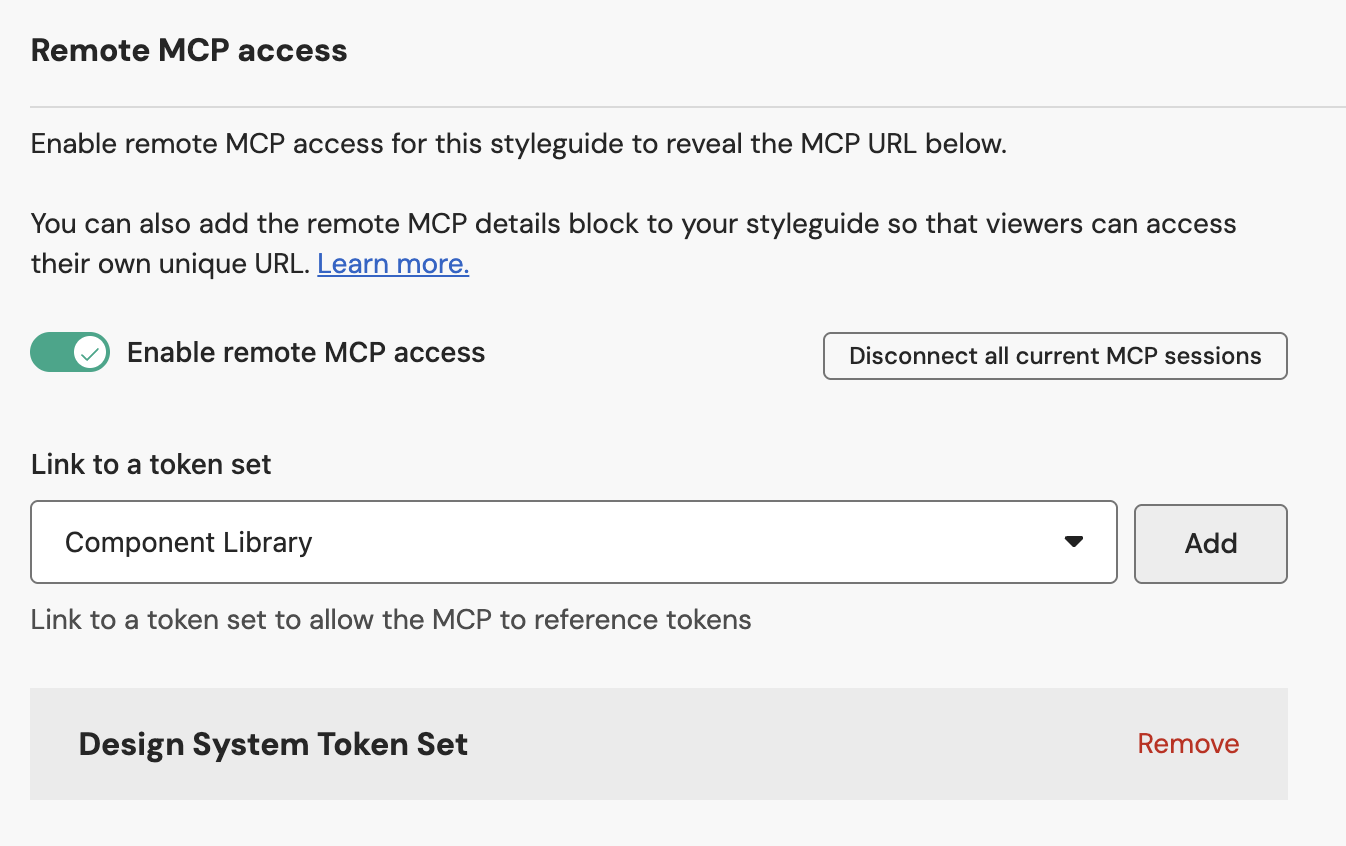Then you can associate your token set with the remote MCP via Styleguide Settings > MCP and Markdown.